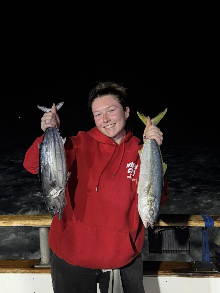 At first light we put out the trollers and the hunt for yellowfin tuna was on. We had a blind jig strike about 8:00 a.m. for a small skipjack tuna. Not what we were looking for so we moved on. Around 9:00 a.m. FIB’ers club member, Tom Handzus sees a large kelp paddy and tells the deckhand. This kelp turned out to be the best stop of the trip with 9 skipjack tuna and 4 small yellowtail. The first bait fish was a yellowtail that was landed by Taylor Anson from The Reel Disciples. Taylor also landed a skipjack so I think she was the only two-fish person on the boat. The next hours were spent traveling the same area with 7 other San Diego boats looking for fish. Late in the day we did find the yellowfin tuna but the fish would not stay with the boat. We did get 2 yellowfin with the jackpot fish a 15.5 pound yellowfin going to Junior Banda.
